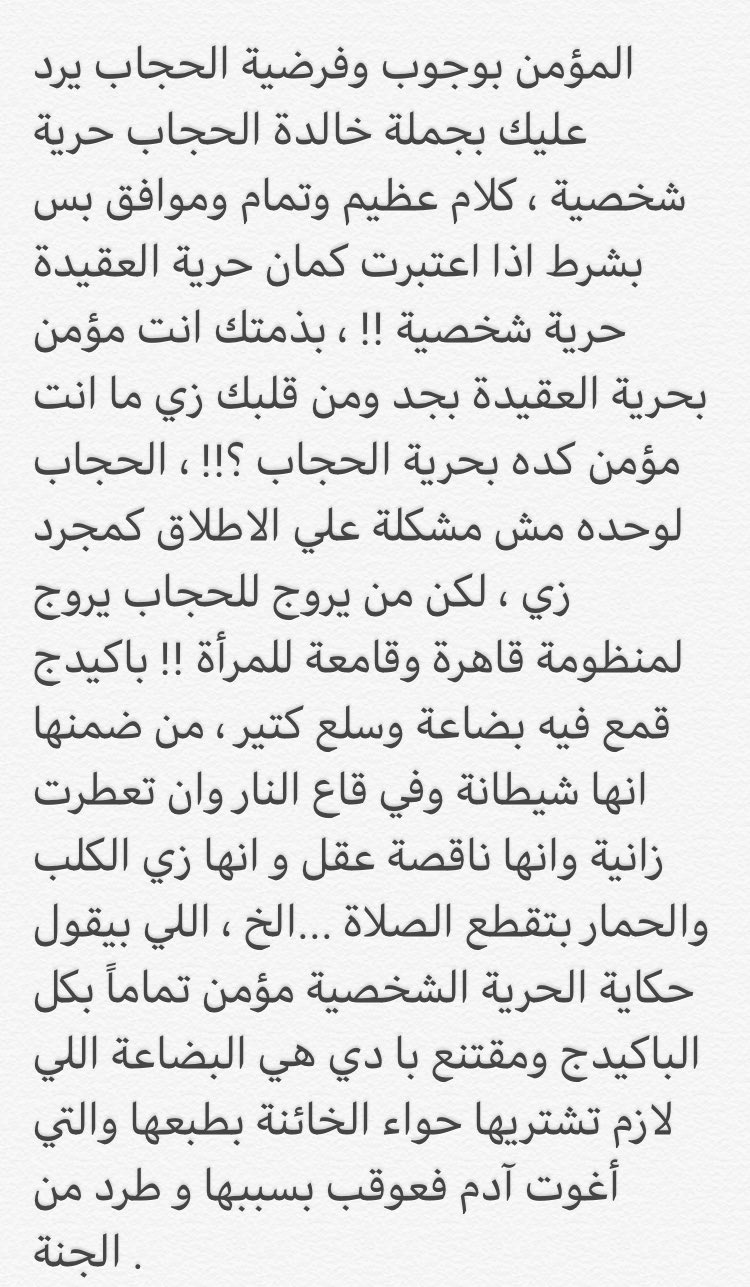 Khaled Montaser در توییتر الي من يقول أن الحجاب حرية شخصية موافقك لو انك موافق أيضا علي ان حرية العقيدة حرية شخصية موافقك لو ان الحجاب مجرد زي من قماش مش
