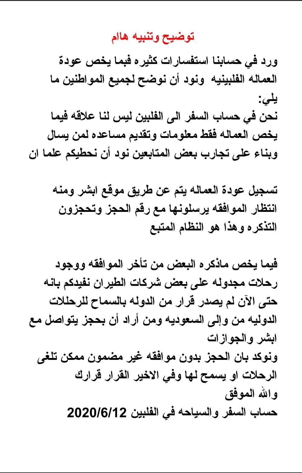 السفر إلى الفلبين On Twitter الرجاء الاطلاع على التنبيه التالي فيما يخص عودة العماله من السعوديه الى الفلبين