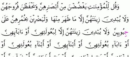 وقل للمؤمنات يغضضن من أبصارهن ويحفظن فروجهن ولا يبدين زينتهن إلا ما ظهر منها وليضربن بخمرهن على جيوبهن ولا يبدين زينتهن إلا لبعولتهن أو آبائهن أو آباء بعولت In 2020