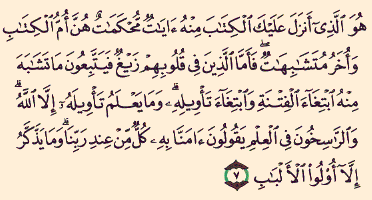 ه و ال ذ ي أ ن ز ل ع ل ي ك ال ك ت اب م ن ه آي ات م ح ك م ات ه ن أ م ال ك ت اب و أ خ ر م ت ش اب ه ات ف أ م ا ال ذ ين ف ي ق ل وب ه م ز ي غ ف ي ت ب ع ون م ا ت ش اب ه م ن ه اب ت غ اء ال ف ت ن ة و اب ت غ اء ت أ و يل ه و م ا