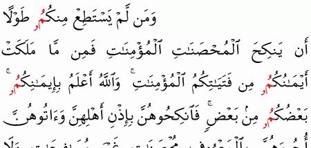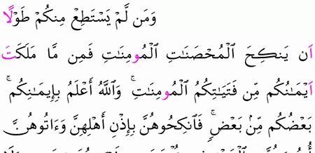 و م ن ل م ي س ت ط ع م ن ك م ط و ل ا أ ن ي ن ك ح ال م ح ص ن ات ال م ؤ م ن ات ف م ن م ا م ل ك ت أ ي م ان ك م م ن ف ت ي ات ك م ال م ؤ م ن ات و الل ه أ ع ل م ب إ يم ان ك م ب ع ض ك م م ن ب ع ض ف ان ك ح وه ن ب إ ذ ن أ ه ل ه ن