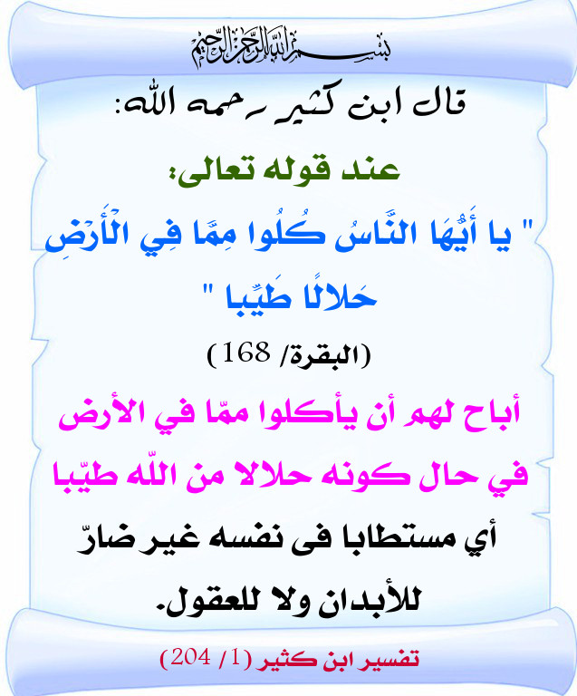 ي ا أ ي ه ا الن اس ك ل وا م م ا ف ي ال أ ر ض ح ل ال ا ط ي ب ا و ل ا ت ت ب ع وا خ ط و ات الش ي ط ان إ ن ه ل ك م ع د و م ب ين تفسير ابن كثير البقرة 168