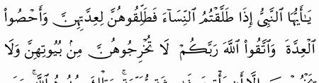 ي ا أ ي ه ا الن ب ي إ ذ ا ط ل ق ت م الن س اء ف ط ل ق وه ن ل ع د ت ه ن و أ ح ص وا ال ع د ة و ات ق وا الل ه ر ب ك م ل ا ت خ ر ج وه ن م ن ب ي وت ه ن و ل ا ي خ ر ج ن إ ل ا أ ن ي أ ت ين ب ف اح ش ة م ب ي ن ة و ت ل ك ح د ود